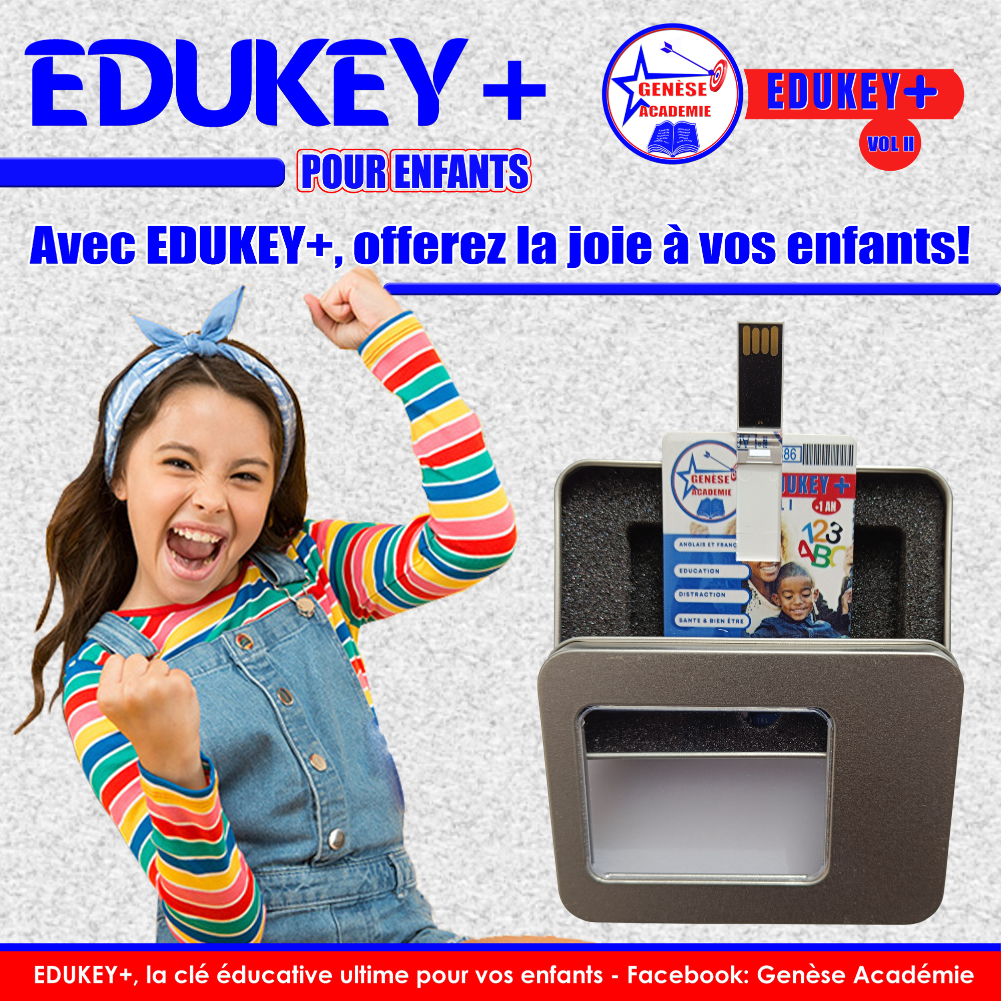 EDUKEY+ est une clé USB 2.0, de type S011, contenant plusieurs centaines de vidéos éducatives pour enfants et pouvant servir aussi pour les grandes personnes car les rubriques sont très variées. Elle peut être utilisée avec une télévision, un ordinateur, dans une voiture, avec la tablette, etc.